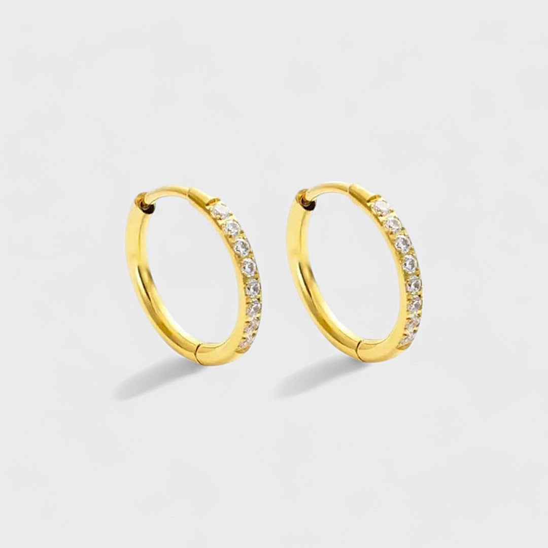 Introducing one of our best-selling earrings, the IRINA earrings: a classic hoop design adorned with clear cubic zirconia gemstones that add the perfect touch of sparkle to any look.