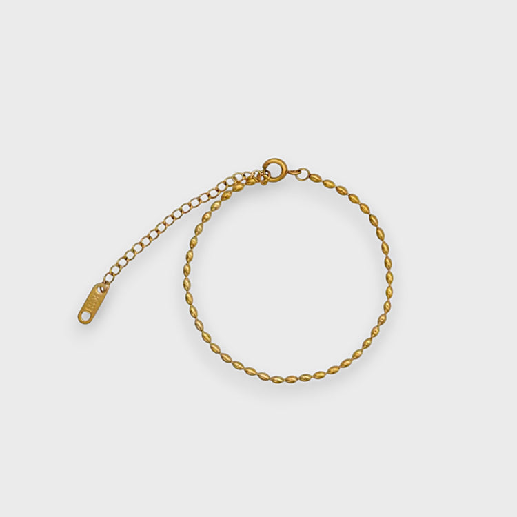 This 18K gold PVD oval bead bracelet combines elegance and simplicity in a timeless design. Its water-resistant finish ensures durability, while its lightweight construction makes it comfortable for everyday wear. Perfect worn alone or layered with other pieces, it's a versatile accessory that adds a sophisticated touch to any look.