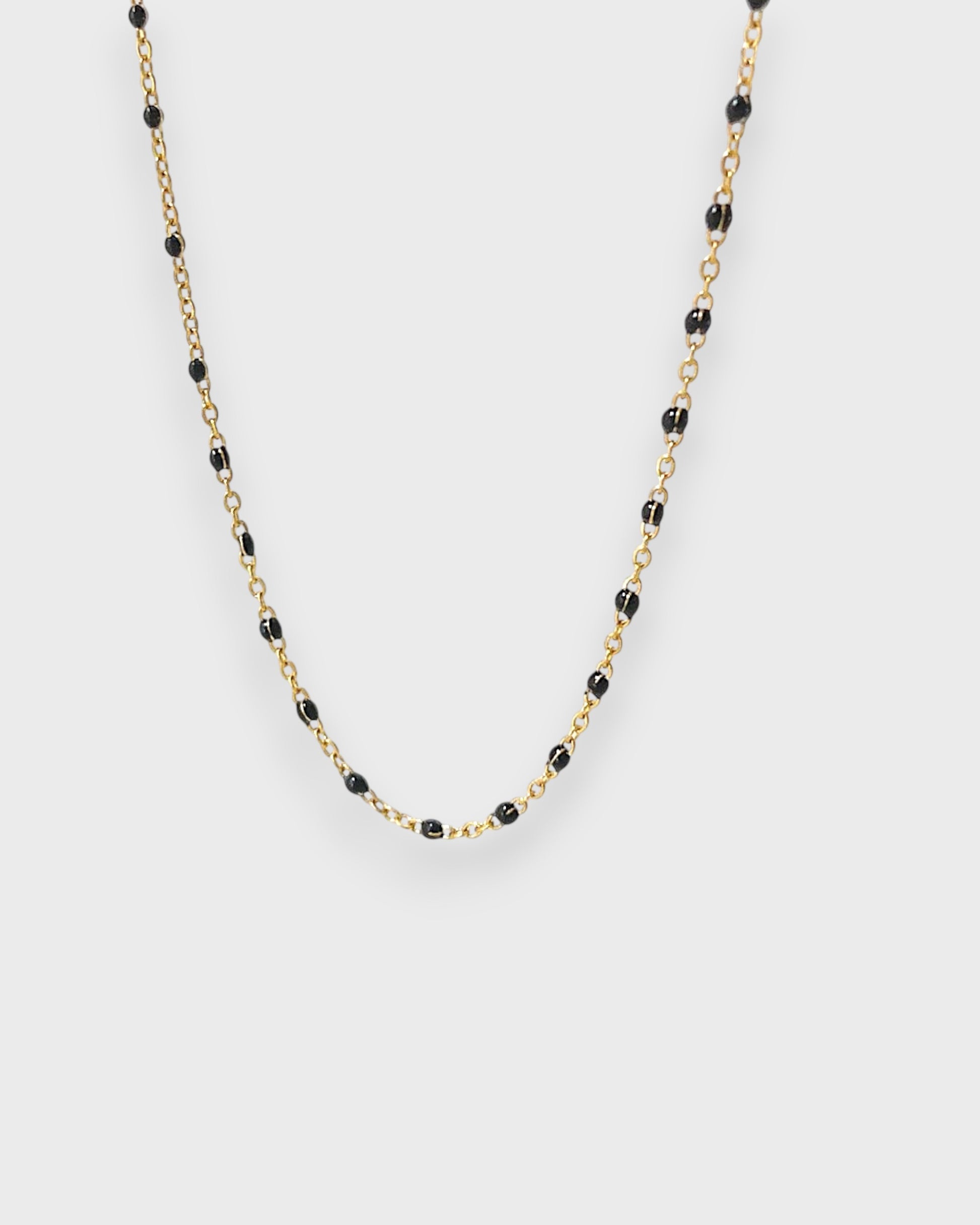 Te presentamos nuestra collar NOELIA con pequeñas cuentas de esmalte negras. Sencillo, minimalista y muy elegante.
