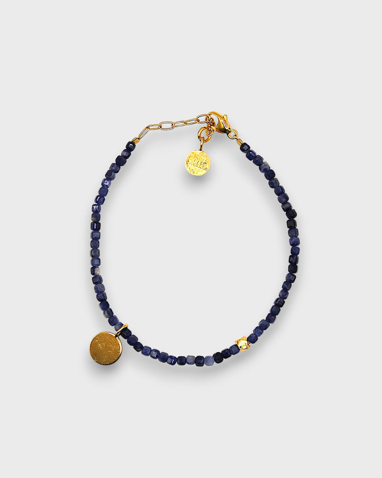 - Materiales: plata 970 (97% contenido de plata) chapada en oro de 14k (1 micra) y cuentas de soladita azul.