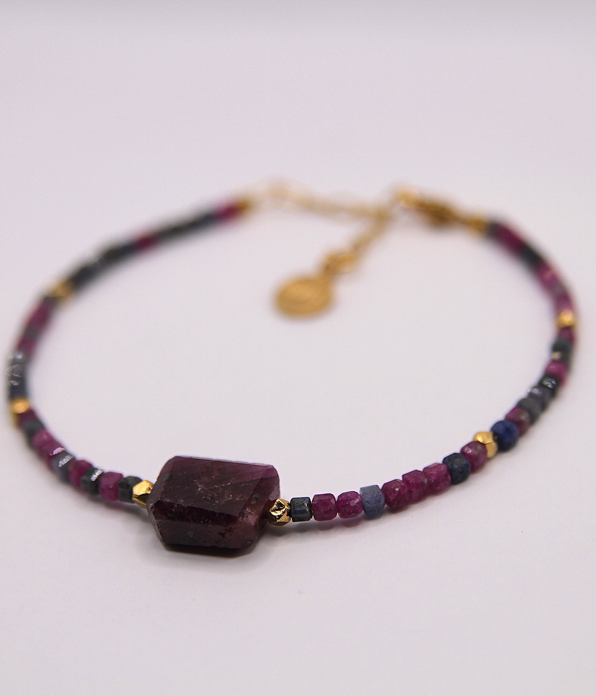 - Materiales: plata 970 (97% contenido de plata) chapada en oro de 14k (1 micra), cuentas de aguamarina y zoisita de rubí.